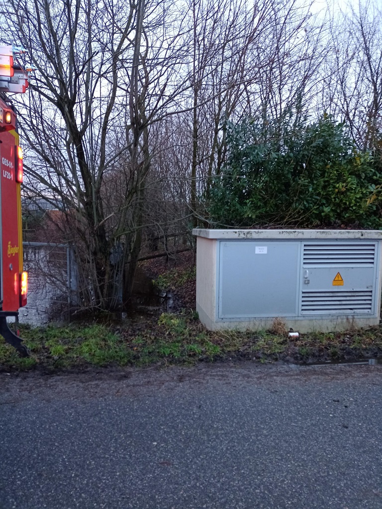 Anschließend musste auf der Schildarpstraße Wasser von einer etwa 20 x 40 m großen Fläche gepumpt werden, da dieses Wasser drohte in eine Trafostation zu laufen. Der Wasserstand wurde ca 15 cm mit Hilfe von Heck- und tauchpumpe abgesenkt. Anschließend wurde die Trafostation noch zusätzlich mit Sandsäcken geschützt.