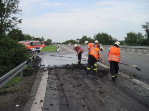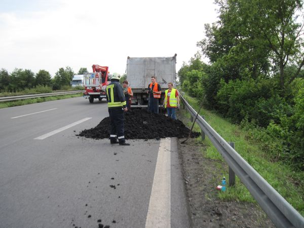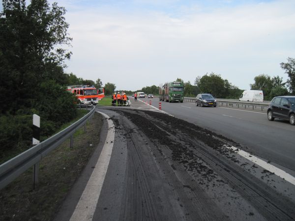 Ein Sattelkipper hatte im Bereich der Auffahrt zur A31 Fahrtrichtung Oberhausen Klärschlamm verloren. Dieser Klärschlamm verschmutzte die Fahrbahn und stellte eine Gefahr für den Verkehr da. Die Freiwillige Feuerwehr wurde als Amtshilfe zur Beseitigung herangezogen. Die verlorene Ladung stellte keine Gefahr für die Umwelt dar, so dass der Schlamm direkt von der Straße gespült werden konnte.