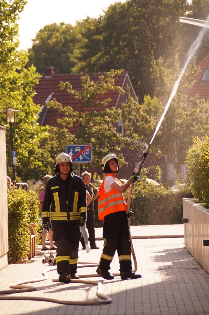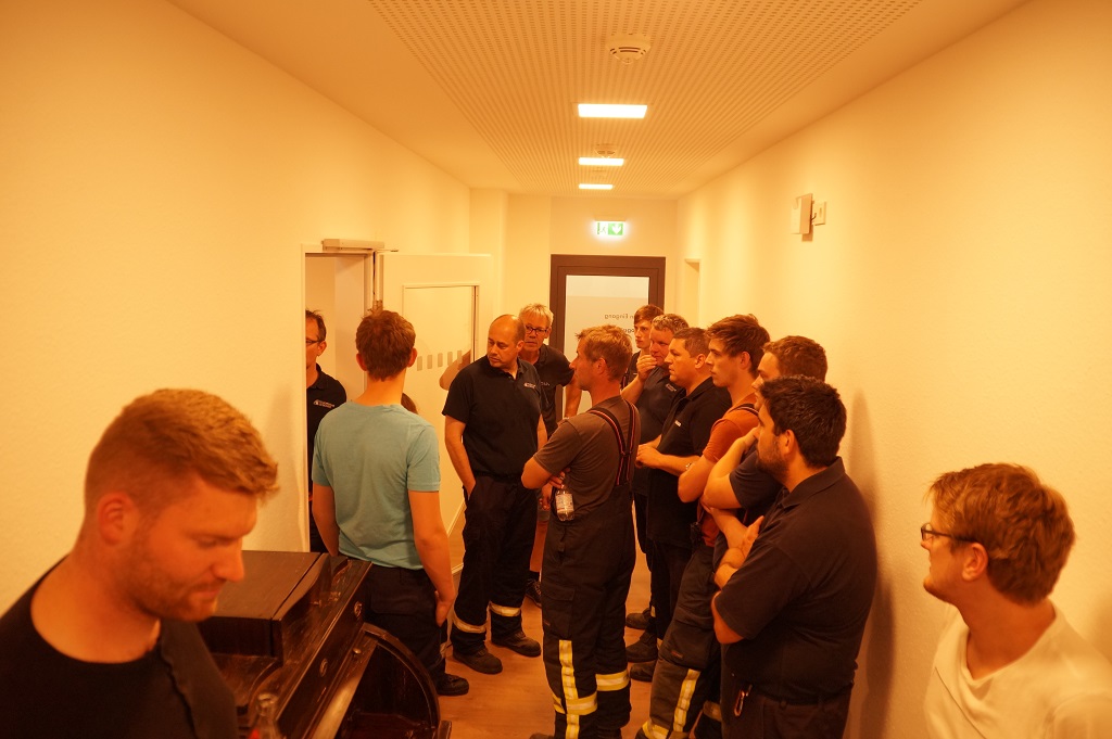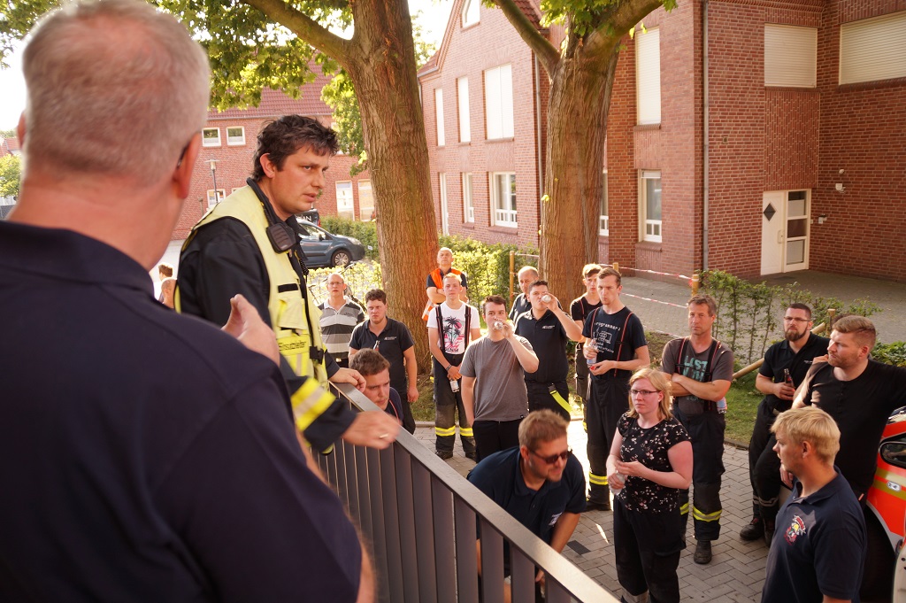 Beim anschließenden Umtrunk zeigte sich sowohl der Leiter der Feuerwehr Christian Nolte wie auch Ibrahim Kortak als Veranwortlicher der Firma Eco-Plan mit dem Ausgang der Übung und der anschließenden Begehung zufrieden. Die Einsatzabläufe liefen entsprechend der vorherigen Einsatzplanungen reibungslos. Die Übung zeigte aber auch Kleinigkeiten auf, die noch optimiert werden können. So profitieren am Ende alle von der Übung, die Feuerwehr bekam bessere Ortskenntnisse und die Bewohner die Gewissheit, dass die brandschutztechnischen Massnahmen greifen und im Ernstfall helfen Leben zu retten.