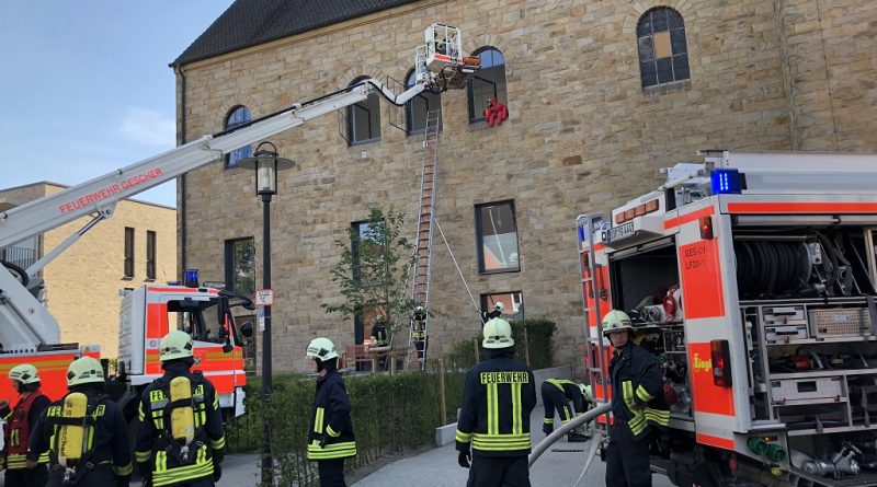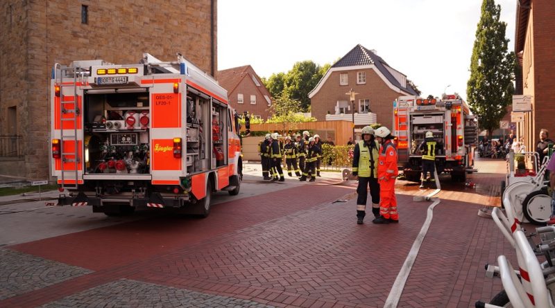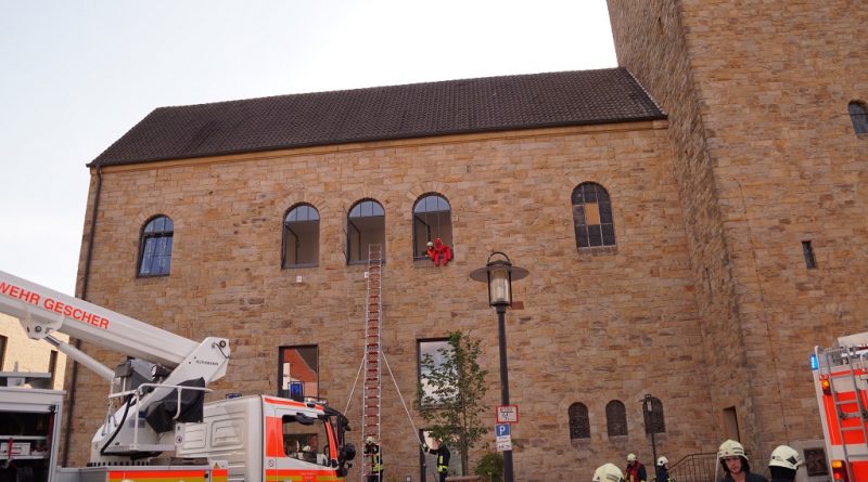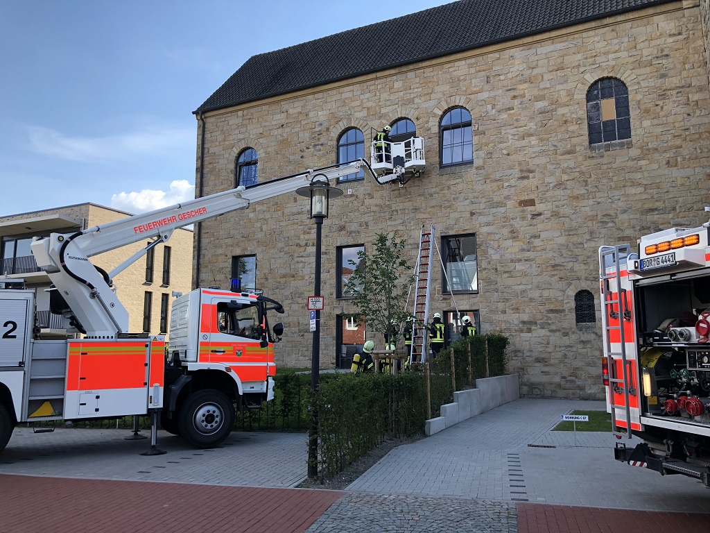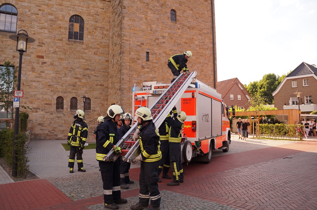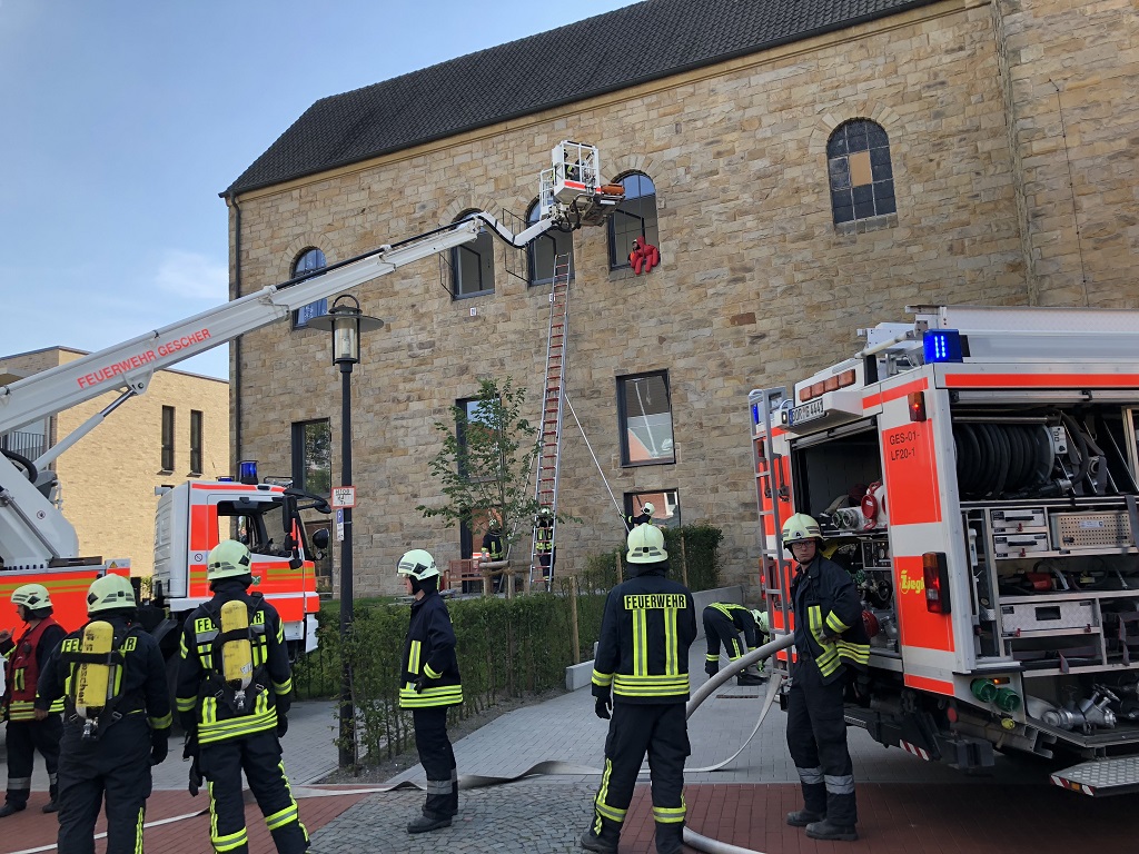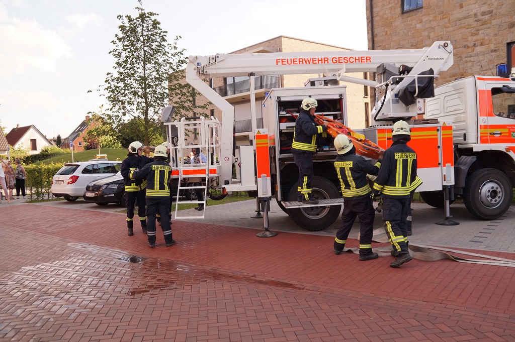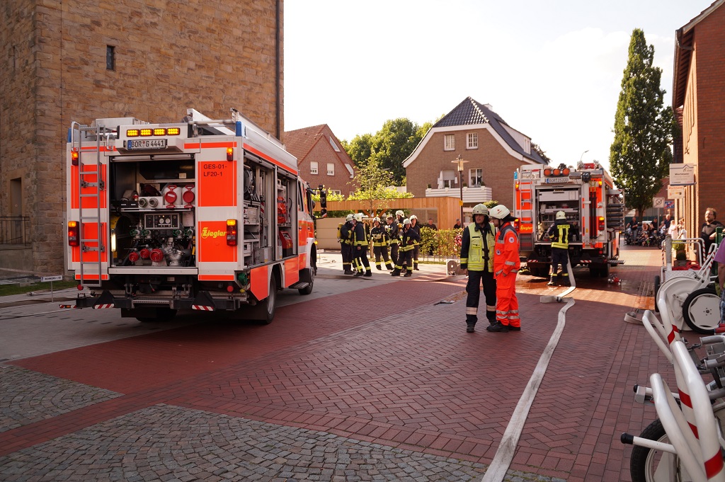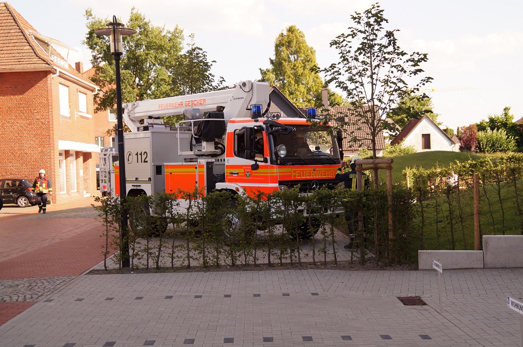 Kurz nach 18 Uhr gingen die Meldeempfänger der Kameraden der Feuerwehr Gescher. Die Brandmeldeanlage im Marienquartier hatte ausgelöst. Dies war der Beginn einer angekündigten Übung. Ziel der Übung war vor allen Dingen, dass sich die Kameraden mit dem Objekt vertraut machen konnten. Angenommen wurde eine Rauchentwicklung im Dachbereich des Hauptgebäudes. Zeitgleich musste eine Person aus einer der Wohnungen im 2. Obergeschoss gerettet werden. Nach einer ersten Erkundung teilte der Einsatzleiter Ralf Beuker die Fahrzeuge, die bereits in einem Bereitstellungsraum nahe des Objektes auf der Gartenstraße eingetroffen waren ein. Während der Teleskopmast sowie ein Löschgruppenfahrzeug mit der Rettung der Person aus dem zweiten Obergeschoss beauftragt wurden, mussten die weiteren Kräfte zur Erkundung und Brandbekämpfung durch das Treppenhaus bis in den Dachstuhl vordringen. Zwischen dem Hauptgebäude und den weiteren Wohngebäuden des Quartieres wurde ein Löschangriff mit mehreren Strahlrohren von der Josef-Willenbrink-Straße aus vorgenommen. Hier arbeiteten Kräfte des Löschzuges Gescher und Hochmoor Hand in Hand. Vor Eintreffen der Feuerwehr hatten die Betreuer der Caritas bereits mit der Evakuierung der Wohngruppe begonnen und führten die Bewohner in den Sammelplatz vor dem Gebäude. Bei der Rettung der Person aus dem zweiten Obergeschoss wurde die Rettung sowohl mit dem Teleskopmast wie auch mit der dreiteiligen Schiebeleiter getestet. Der DRK Ortsverein kümmerte sich um die Betreuung der Verletzten.