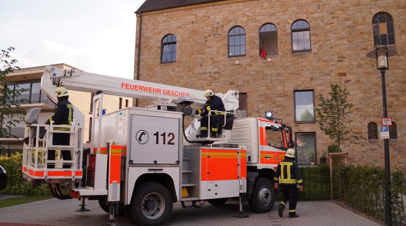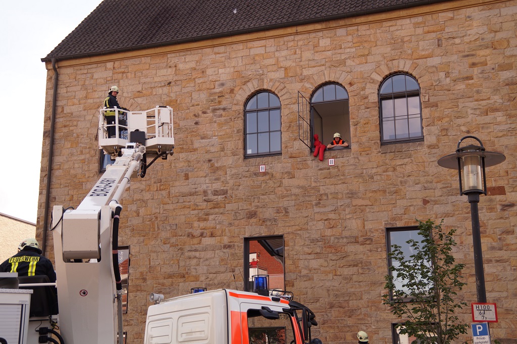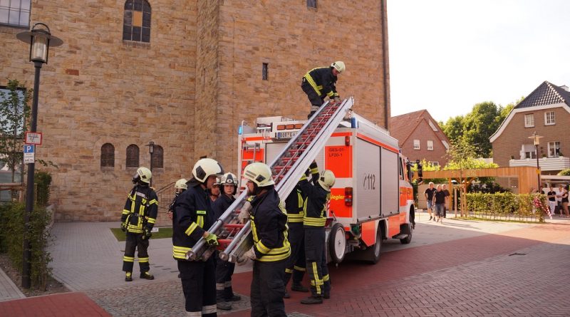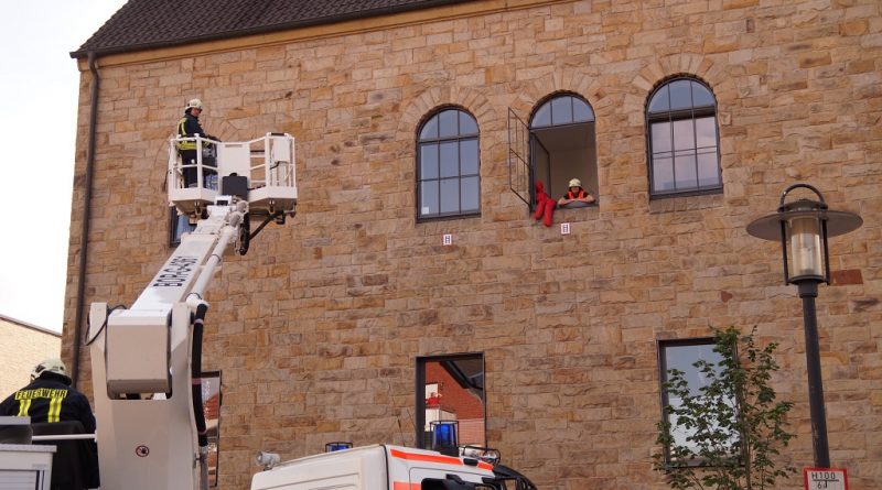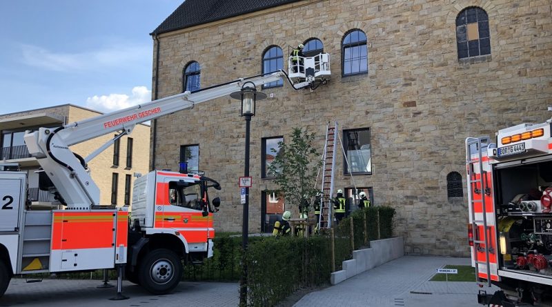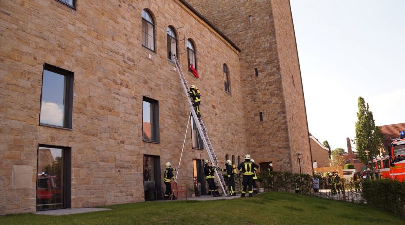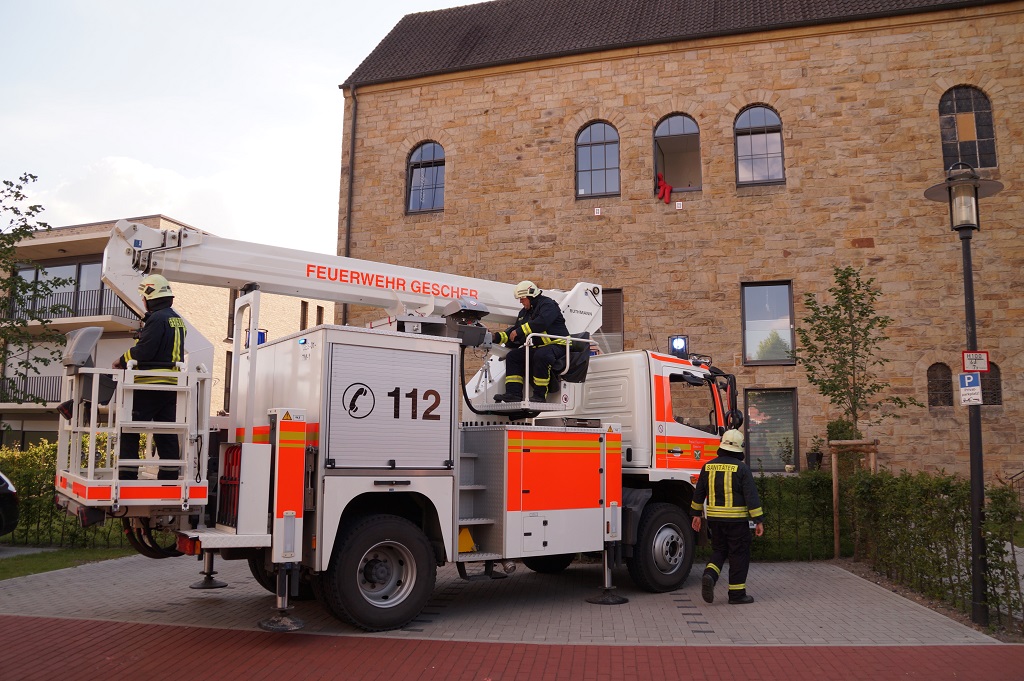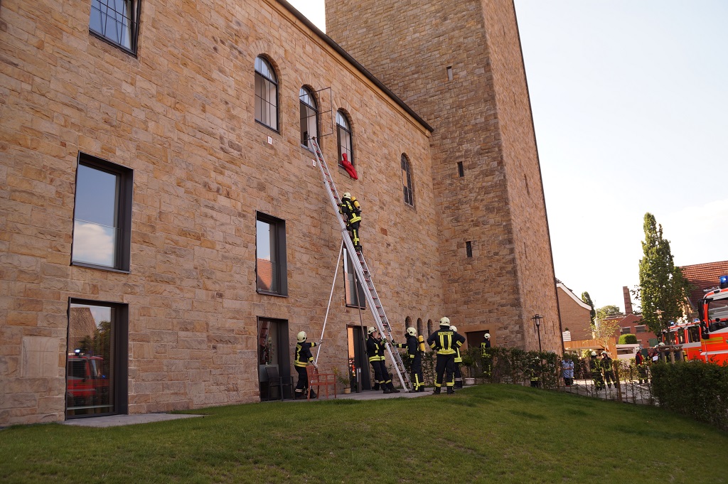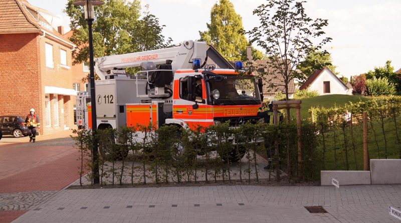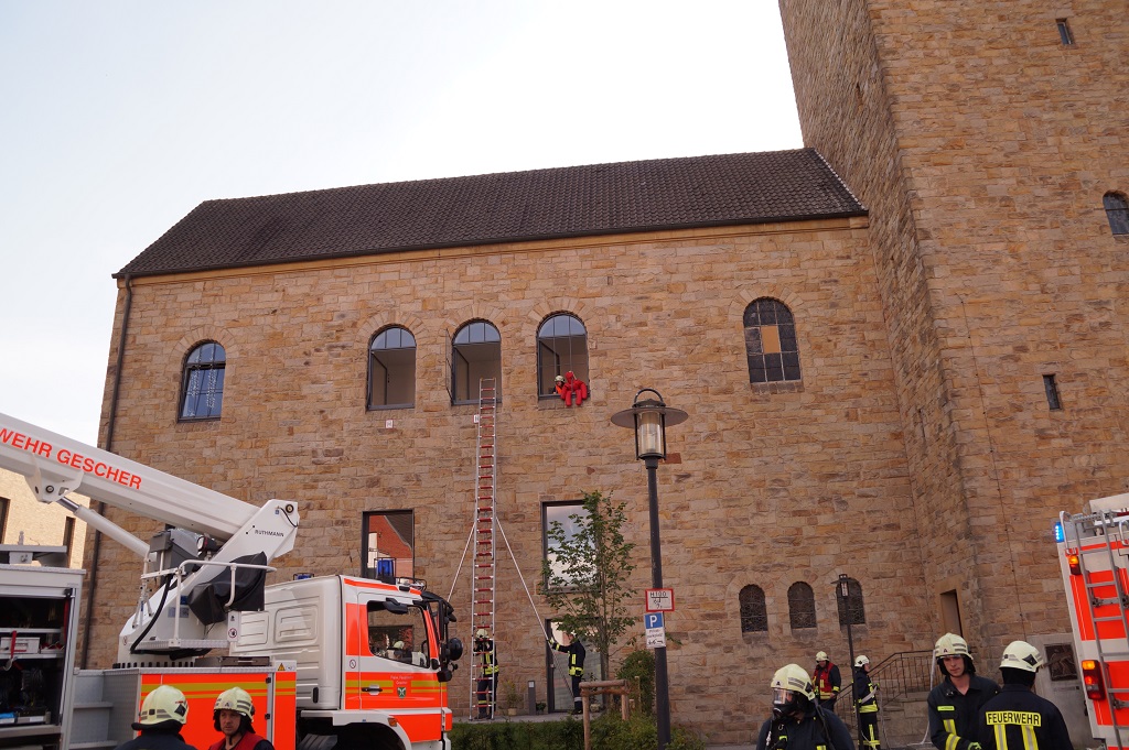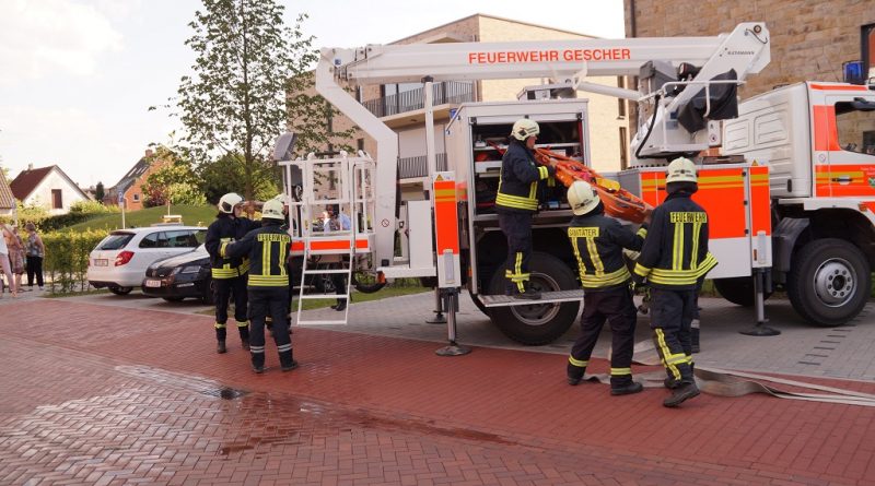 Kurz nach 18 Uhr gingen die Meldeempfänger der Kameraden der Feuerwehr Gescher. Die Brandmeldeanlage im Marienquartier hatte ausgelöst. Dies war der Beginn einer angekündigten Übung. Ziel der Übung war vor allen Dingen, dass sich die Kameraden mit dem Objekt vertraut machen konnten. Angenommen wurde eine Rauchentwicklung im Dachbereich des Hauptgebäudes. Zeitgleich musste eine Person aus einer der Wohnungen im 2. Obergeschoss gerettet werden. Nach einer ersten Erkundung teilte der Einsatzleiter Ralf Beuker die Fahrzeuge, die bereits in einem Bereitstellungsraum nahe des Objektes auf der Gartenstraße eingetroffen waren ein. Während der Teleskopmast sowie ein Löschgruppenfahrzeug mit der Rettung der Person aus dem zweiten Obergeschoss beauftragt wurden, mussten die weiteren Kräfte zur Erkundung und Brandbekämpfung durch das Treppenhaus bis in den Dachstuhl vordringen. Zwischen dem Hauptgebäude und den weiteren Wohngebäuden des Quartieres wurde ein Löschangriff mit mehreren Strahlrohren von der Josef-Willenbrink-Straße aus vorgenommen. Hier arbeiteten Kräfte des Löschzuges Gescher und Hochmoor Hand in Hand. Vor Eintreffen der Feuerwehr hatten die Betreuer der Caritas bereits mit der Evakuierung der Wohngruppe begonnen und führten die Bewohner in den Sammelplatz vor dem Gebäude. Bei der Rettung der Person aus dem zweiten Obergeschoss wurde die Rettung sowohl mit dem Teleskopmast wie auch mit der dreiteiligen Schiebeleiter getestet. Der DRK Ortsverein kümmerte sich um die Betreuung der Verletzten.