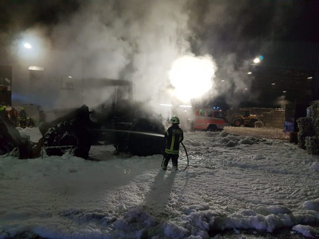 Bei Eintreffen der Feuerwehr stand der Radlader bereits in Vollbrand und das Einsatzstichwort wurde von Fahrzeugbrand Gruppe auf Feuer Zug erhöht. Die ersten Einsatzkräfte verhinderten unter Atemschutz eine Brandausbreitung durch eine Riegelstellung zu in unmittelbarer Nähe stehenden Kunststoffballen. Der Radlader wurde dann mit Schaum gelöscht. Die Wasserversorgung wurde durch Pendelverkehr mit dem Tanklöschfahrzeug und dem Hilfeleistungslöschfahrzeug zu dem Hydranten vor dem Betriebsgelände sichergestellt. Der Teleskopmast leuchtete die Einsatzstelle aus.