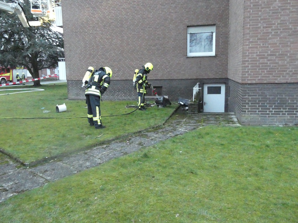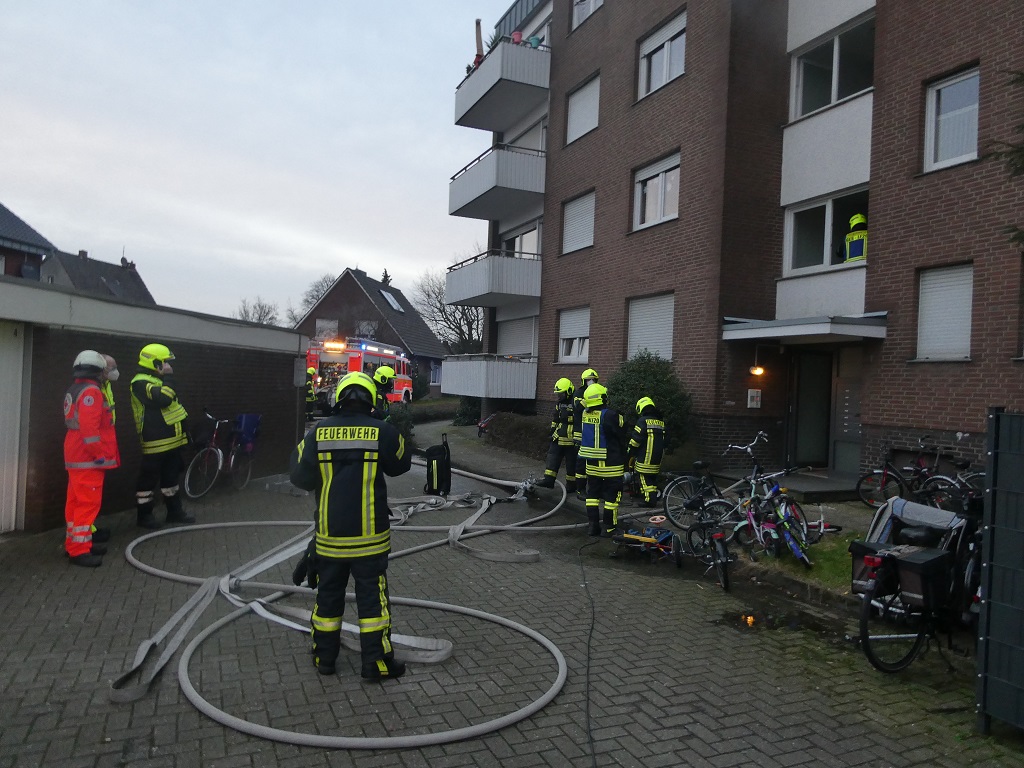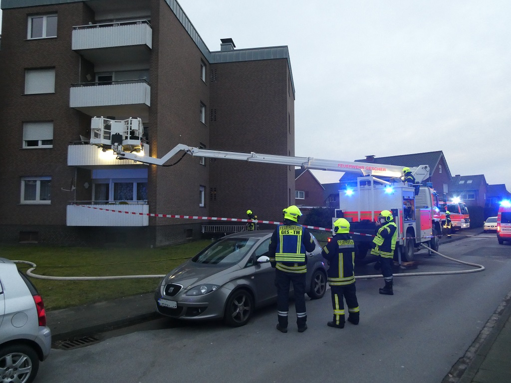 Gegen 16:37 Uhr wurde die Feuerwehr zu einem Wohnungsbrand in einem Mehrfamilienhaus auf dem Amselweg gerufen. Bei Eintreffen der ersten Kräfte war die Lage unübersichtlicht, da zwar die Wohnungsinhaberin aus der Brandwohnung sich außerhalb des Gebäudes befand jedoch unklar war wo sich mehrere Personen aus weiteren befanden. Es hieß zunächst, dass sich diese noch in den Wohnungen befanden. So wurde sofort das Stichwort auf Vollalarm für die gesamte Feuerwehr Gescher mit dem Stichwort Menschenleben in Gefahr erhöht. In der betroffenen Wohnung stand die Küche in Vollbrand. Ein Trupp unter Atemschutz ging sofort zur Brandbekämpfung vor. Parallel wurden weiter Kräfte über dem Teleskopmast eingesetzt. Zudem wurden alle Personen aus den im Wohnkomplex befindlichen Wohnungen ins Freie geführt und in einem Sammelplatz registriert. Insgesamt wurden 28 Personen, darunter auch einige Kleinkinder aus diesem Wohnkomplex gerettet. Zusätzlich wurden weitere Bewohner des Nachbarkomplexes zunächst draußen betreut. Die Frau aus der Brandwohnung musste zur weiteren Behandlung mit dem Rettungswagen ins Krankenhaus gebracht werden. Weitere Personen wurden nicht verletzt, mussten jedoch teilweise während Ihres Aufenthaltes draußen mit Decken versorgt werden.