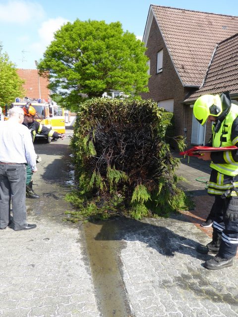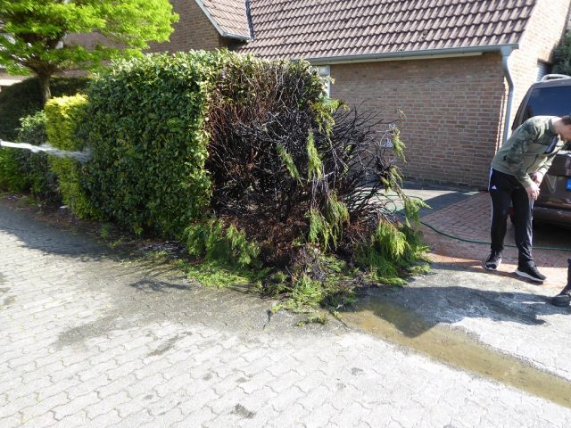 Zu einem Heckenbrand auf der Schillerstraße wurde die Feuerwehr Gescher gegen 11 Uhr alarmiert. Die Feuerwehr löschte den Brand mit dem Schnellangriff und entfernte die verbrannten Heckenstümpfe mit der Kettensäge.