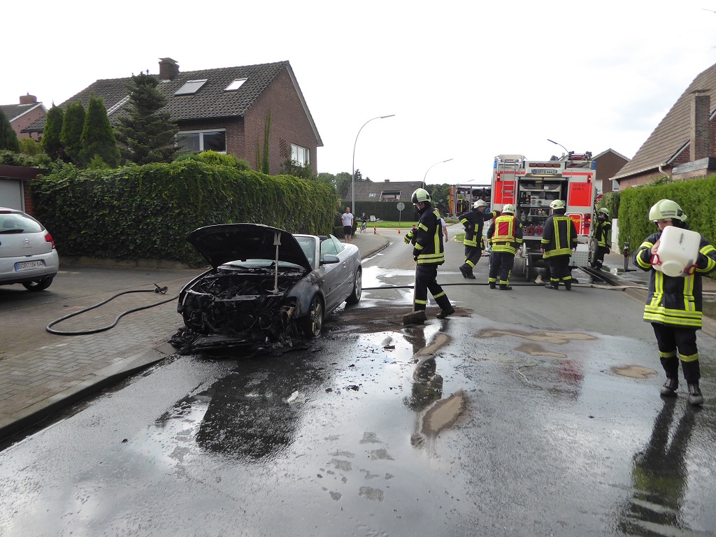 Ein technischer Defekt an einem PKW verursachte zunächst eine Ölspur beginnend auf der Franz-Josef-Straße bis zum Westfalenring. Dort blieb das Fahrzeug liegen und begann im Motorraum zu brennen. Beim Eintreffen der Feuerwehr brannte der komplette vordere Bereich des Fahrzeuges. Der Brand wurde unter Atemschutz mit einem Strahlrohr gelöscht. Zeitgleich kümmerten sich weitere Kameraden um die Ölspur. Der Einsatz war nach ca. 1 Stunde beendet.