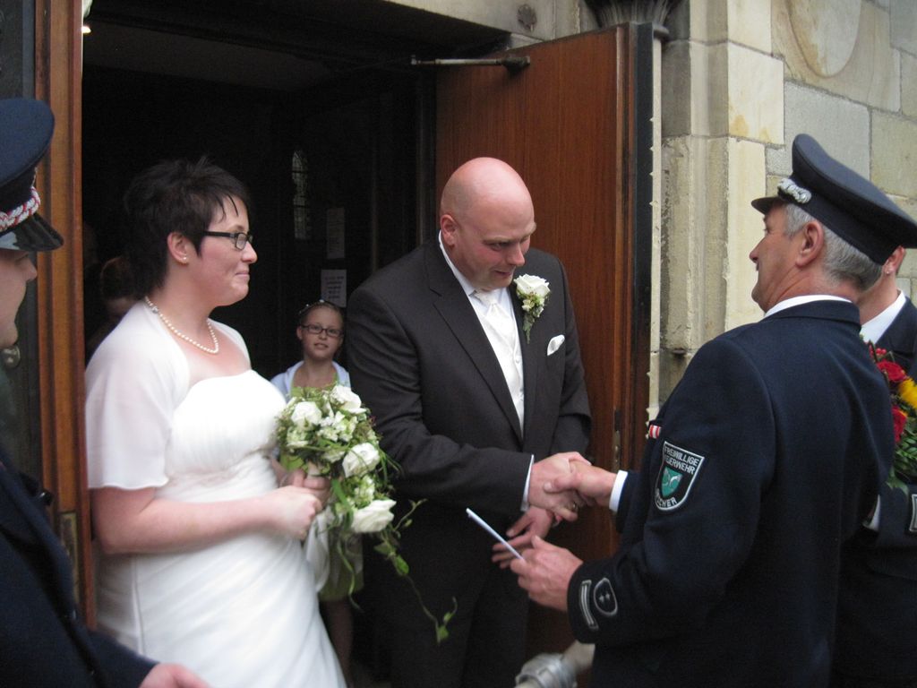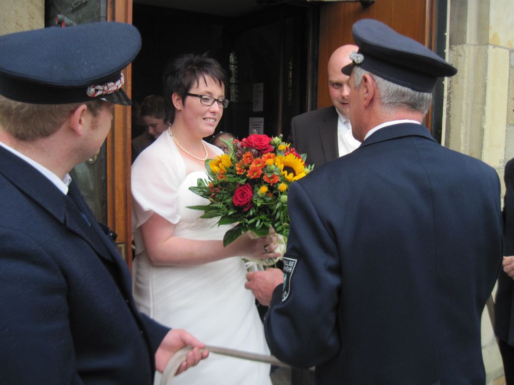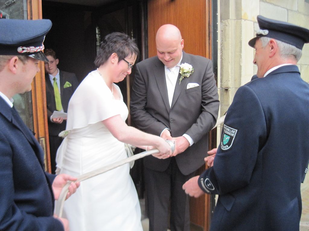 Die Feuerwehr hat es sich nicht nehmen lassen Ihrem Kamerad Jörg Winnemöller und seiner Sabrina zur Hochzeit zu gratulieren. So standen sie in Osterwick mit dem feuerwehrtypischen Spalier bereit. Traditionell musste das Brautpaar eine Schlauchkupplung lösen bevor sie durch das Spalier gehen konnten. Die Kameraden der Feuerwehr begrüßten das frische Brautpaar mit dem Feuerwehrgruß.