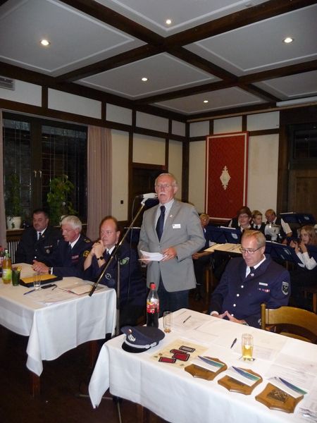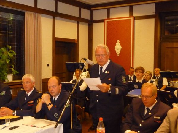 Jetzt hatte der Bürgermeister H. Effkemann die Gelegenheit ein paar Grußworte an die Feuerwehrkameraden zu richten. Er bedankte sich im Namen des Rates, der Verwaltung und den Bürgern dafür, dass die Feuerwehr ständig parat stehen würde um Hilfe leisten zu können. Die Bürger können sich sicher fühlen. Er betonte, dass man den Fahrzeugpark erneuern und so auf den aktuellen Stand bringen konnte. Dabei sei es dem Vorbereitungsteam aus Feuerwehr und Verwaltung (insb. Herrn Entrup) gelungen eine für Gescher passgenaue Lösung zu finden, die am Ende auch noch viel Geld für Gescher gespart hätte. Auch das neue Raumkonzept an der Feuerwache Hochmoor, die den Unfallverhütungsvorschriften gerecht werde, bringe die Arbeit der Feuerwehr ein weites Stück voran. Er hoffe, dass auch für zukünftige Vorhaben in Gescher die Stadt alles schultern kann und eine optimale wie auch wirtschaftlich gute Lösung für Gescher und die Feuerwehr gefunden wird. Er dankte der Feuerwehr insbesondere für Ihren Einsatz am Hochhaus, denn durch das beherzte und koordinierte Eingreifen konnte ein viel größeres Leid der Betroffenen gemildert werden. Er freute sich, dass Christian Nolte für weiter 6 Jahre das Amt des Stadtbrandinspektors übernehmen werde. Gleichzeitig musste er mit einem tränendem Auge mitteilen, dass Wolfgang Klennert aus dem Amt des stellv. Stadtbrandinspektors ausscheidet, da er viel für den Löschzug Hochmoor getan habe, insbesondere für die gute Zusammenarbeit der beiden Löschzüge Hochmoor und Gescher. Abschließend vergaß er auch nicht den Dank an die starken Frauen und Freundinnen der Kameraden zu richten, denn sie müssen so manches Mal auf Sie verzichten, wenn es zu Einsätzen oder Übungen ginge. Nur mit einem solchen Rückhalt könne eine Feuerwehr funktionieren.