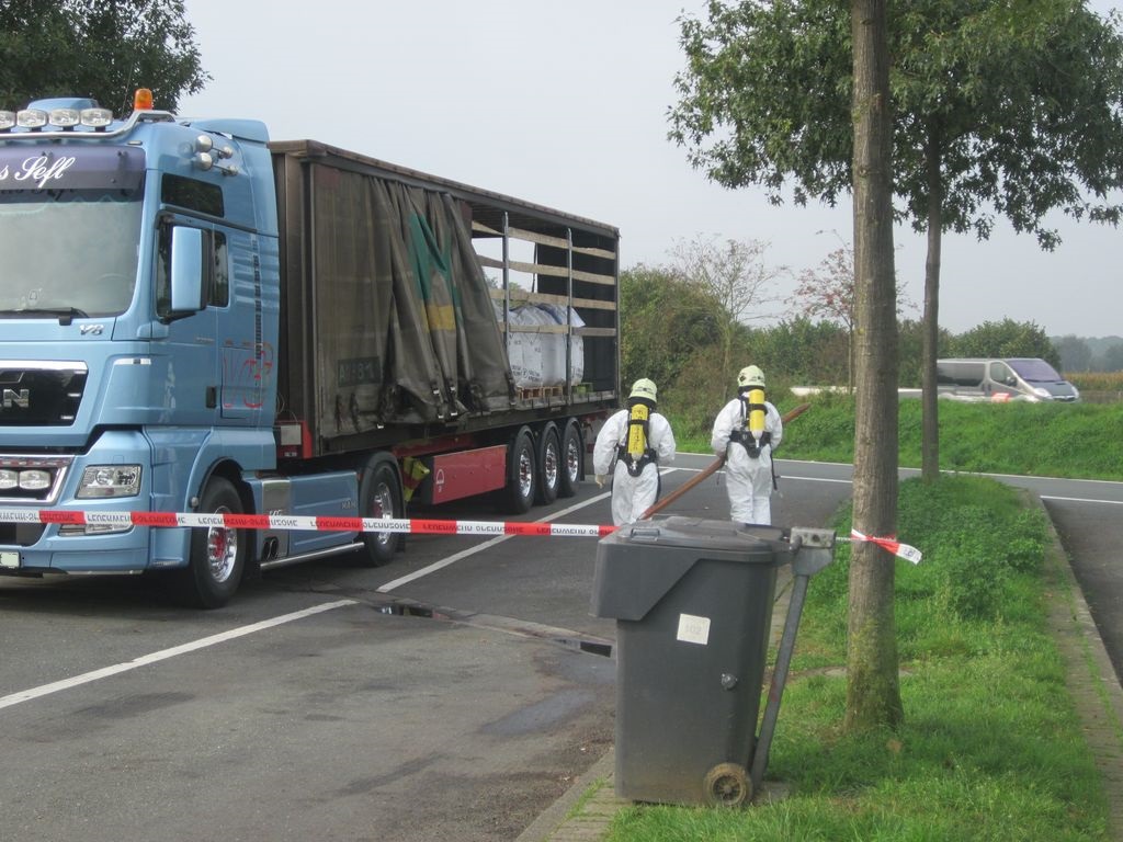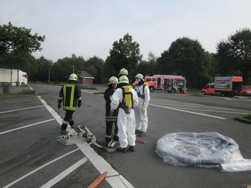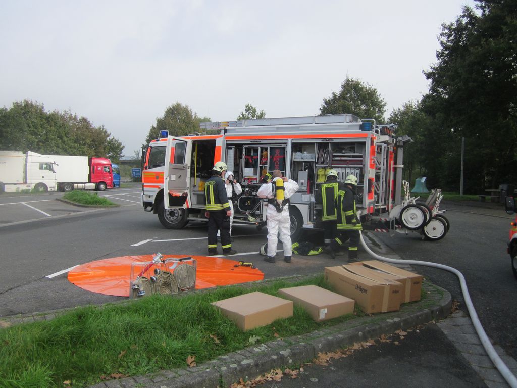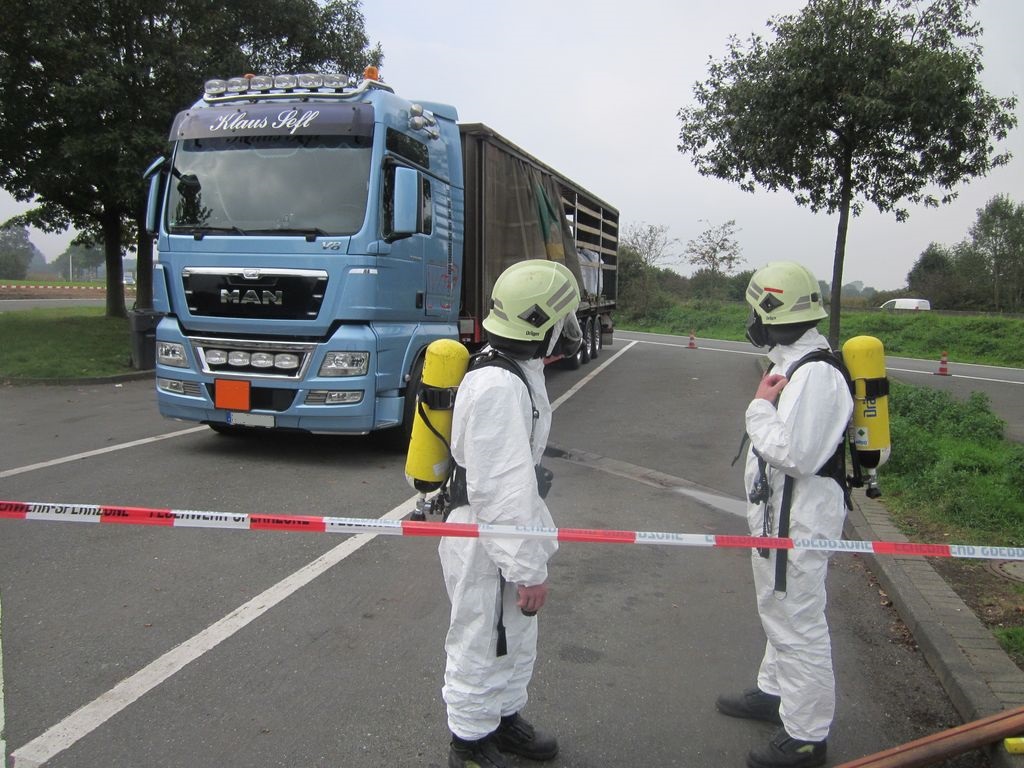 Bei einer Routinekontrolle der BAG auf dem Autobahnparkplatz Hochmoor ist durch den Kontrolleur festgestellt worden, dass Gefahrgut offen auf einem Big-Bag lag. Ob der Big-Bag beschädigt war konnte zunächst nicht festgestellt werden. Daher wurde die Feuerwehr alarmiert zu einem Einsatz gefährliche Stoffe. Als Erstmassnahme wurde die Einsatzstelle weiträumig abgesperrt und der Parklpatz geleert sowie anschließend komplett gesperrt. In der Zwischenzeit wurden die Fahrzeugpapiere überprüft und festgestellt, dass es sich bei dem Stoff um einen gesundheitsgefährlichen und teilweise giftigen Stoff handelt. Daher wurde ein Atemschutztrupp mit Einmalanzügen und Atemschutz ausgerüstet. Dieser ging zur weiteren Erkundung vor. Es wurde festgestellt, dass es sich bei dem Austritt um Restmengen während des Befüllvorganges handeln mussten. Der Big-Bag als solches war nicht beschädigt. So wurde nach zusätzlicher Rücksprache mit Gefahrgutexperten von TUIS der offen liegende Stoff in Kunststoffbehälter umgefüllt. Anschließend wurden auch die Einmalanzüge in einen weiteren Kunststoffbehälter entsorgt. Nach gut 1,5 Stunden war der Einsatz für die Feuerwehr Gescher beendet.