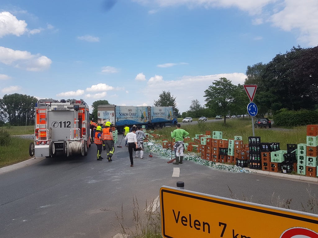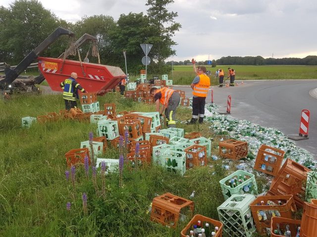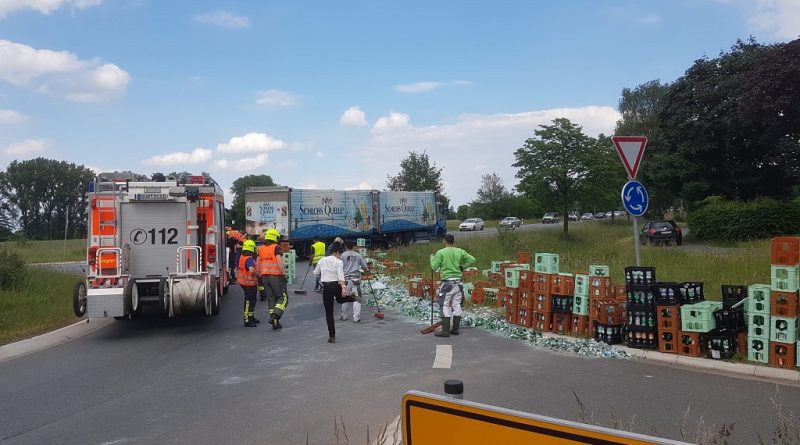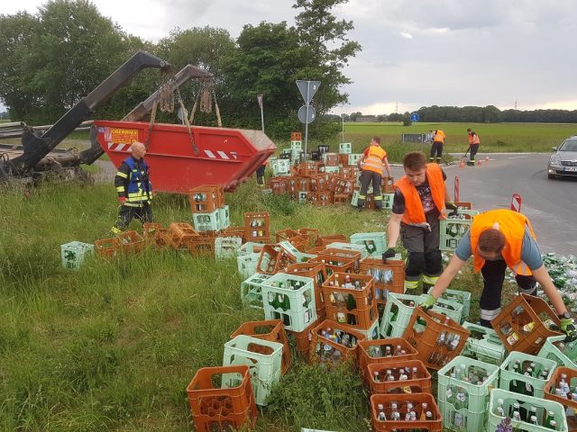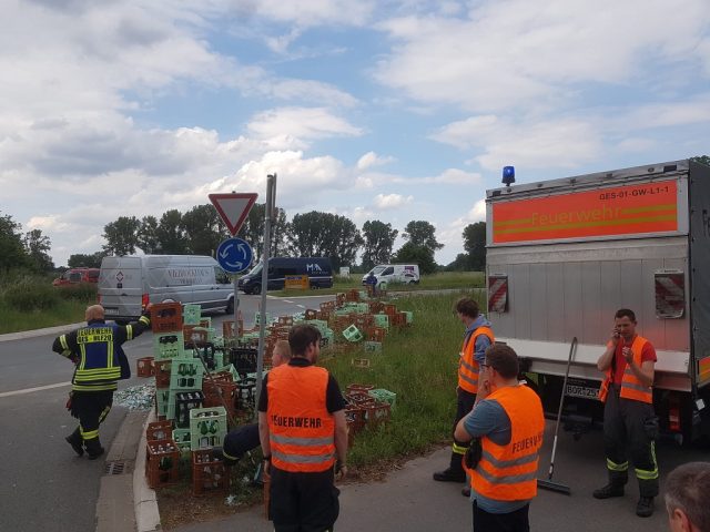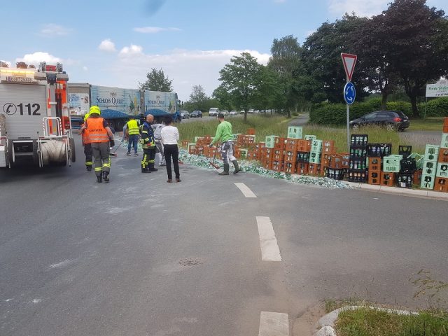 Gegen 16 Uhr wurde die Feuerwehr zu einem Unfall am Kreisverkehr B525/L608 gerufen. Dort hatte ein LKW ca. 100 Getränkekisten mit Wasserflaschen aus Glas verloren. Die Kisten versperrten den Kreisverkehr. Die Feuerwehr räumte die Kisten von der Straße und beseitigte die Glasreste von der Straße, so daß der Verkehr wieder fliessen konnte. Während der Bergung kam es zu Verkehrsbehinderungen.