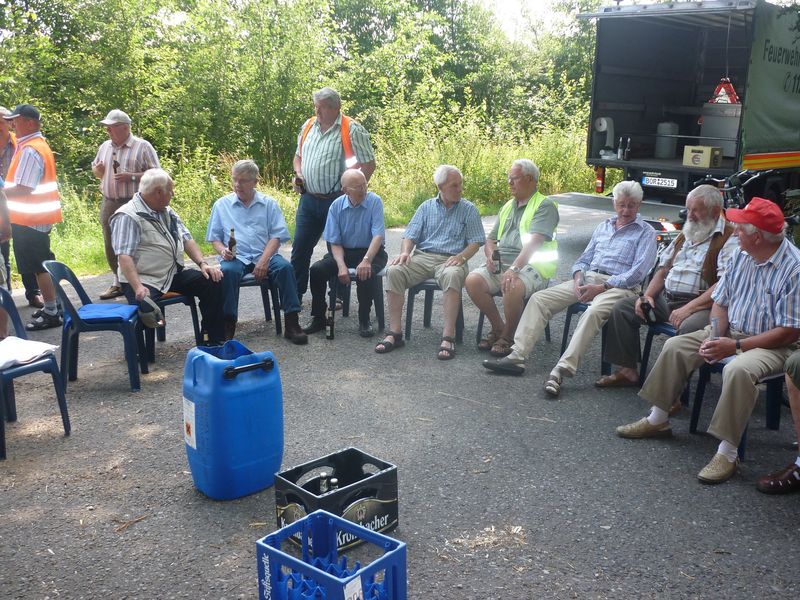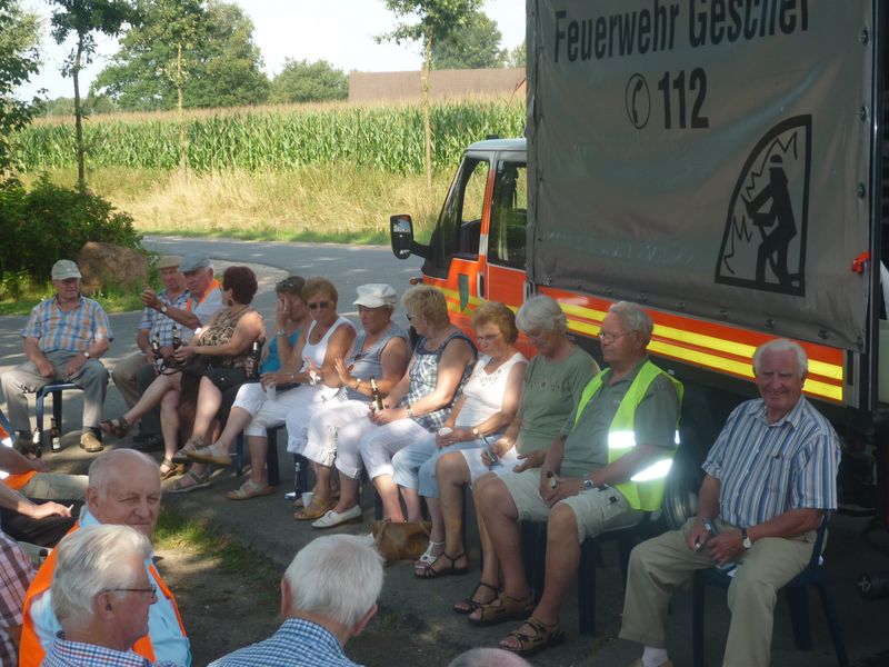 In diesem Jahr hatten sich die „alten Kameraden“ aus Hochmoor um die Organisation der Tour gekümmert. Gleichzeitig machten sich die Trupps aus Gescher und Hochmoor auf den Weg. In Höhe des „Fünffingerweges“ traf man sich zu einem Satteltrunk um dann gemeinsam weiter zu radeln. Der Trupp war auf mehr als fünfzig Radler und Radlerinnen angewachsen. Für diejenigen, die des Radelns nicht mehr mächtig waren, hatte man einen Fahrdienst organisiert. Die Organisatoren hatten eine wunderschöne Strecke ausgearbeitet. Über Nordvelen ging es durchs Dorf weiter durch Waldvelen in Richtung Hochmoor. Im Anglerparadies wurde man bereits zur großen Kaffeetafel erwartet. Albert Kerkfeld ließ es sich nicht nehmen, die Kameraden der Feuerwehr durch den Park zu führen. Den Abschluss des Tages beging man im neu gestalteten Gerätehaus in Hochmoor. Es gab viel zu erzählen, nicht nur von gemeinsamen Einsätzen. Erst in den Abendstunden verabschiedeten sich die Gescheraner bei ihrem Gastgeber, dem Löschzug Hochmoor. Machbar war diese gemeinsame Ausfahrt durch das Mitwirken einiger aktiver Kameraden, denen hierfür ein besonderer Dank gebührt. Spätestens zum 50-jährigen Bestehen des Löschzuges Hochmoor am 15. September wollen sich die Kameraden der Alters- und Ehrenabteilungen wiedersehen.