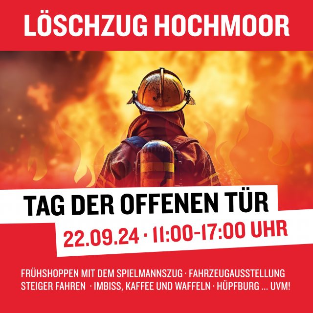 Am 22.09.2024 ist es so weit. Der Löschzug Hochmoor veranstaltet von 11 bis um 17 Uhr einen Tag der offenen Tür am Feuerwehrgerätehaus auf der Landsbergstraße und lädt die Bevölkerung ein.
