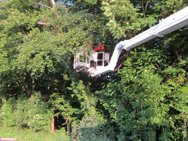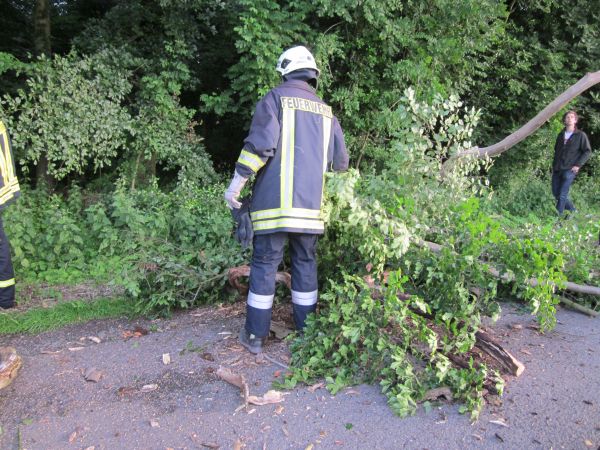 Aufmerksame Passanten bemerkten das auf dem Südlohner Damm hinter der Brücke zur L608 ein Baum auf die Straße zu stürzten drohte. Die herbeigerufene Gruppe des Löschzuges Gescher beseitigte die Gefahrenstelle mittels Motorsägen und dem Teleskopmast.