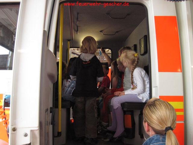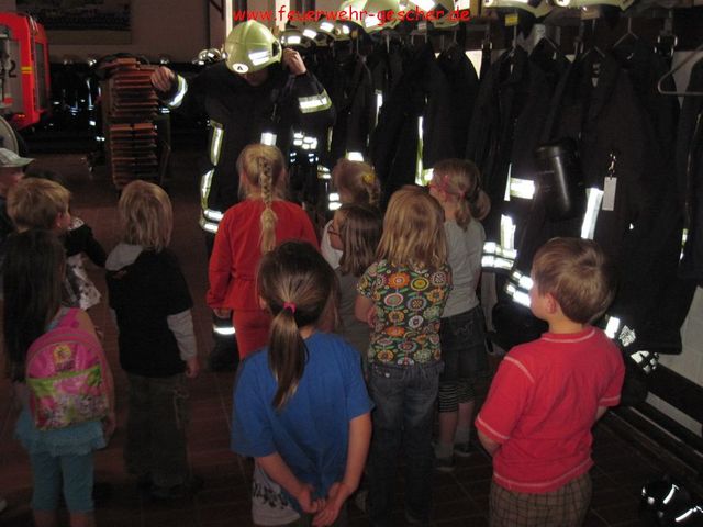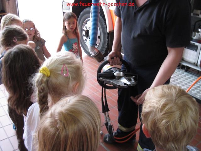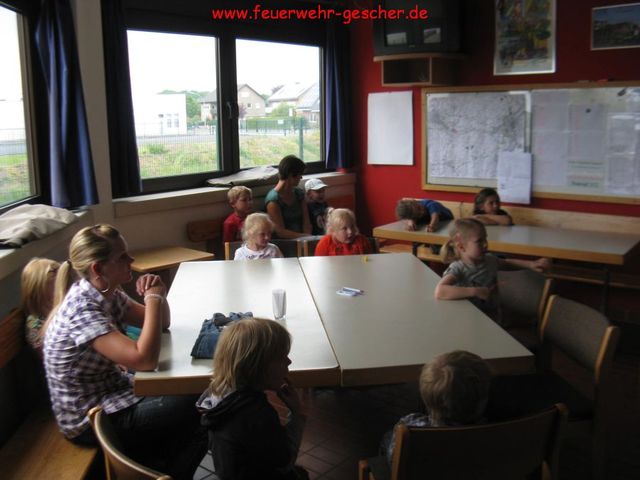 Der DRK-Kindergarten „Kleine Welt“ ist sich seiner Aufgabe bewusst und setzt seit Jahren auf die Brandschutzerziehung. Hilfreich ist der Brandschutzkoffer, der von der Feuerwehr zur Brandschutzerziehung zur Verfügung gestellt wird. Er beinhaltet, Literatur, CD`s und selbst eine Telefonanlage, so dass der ordnungsgemäße Notruf geübt werden kann. Zum Abschluß besuchten die Kinder „ihre“ Feuerwehr. Uwe Luters ließ hierbei keine Frage offen. Höhepunkt war natürlich die „Nassübung“ sowie eine Fahrt im Feuerwehrauto. Hier konnten sich die Kids als echte Feuerwehrmänner fühlen.
