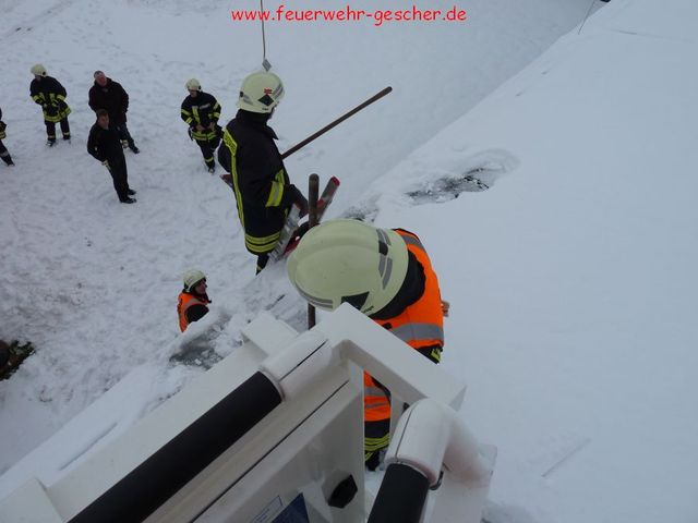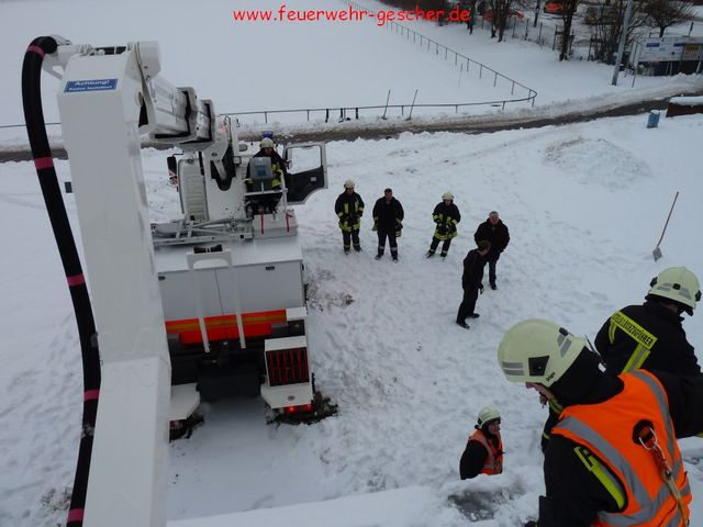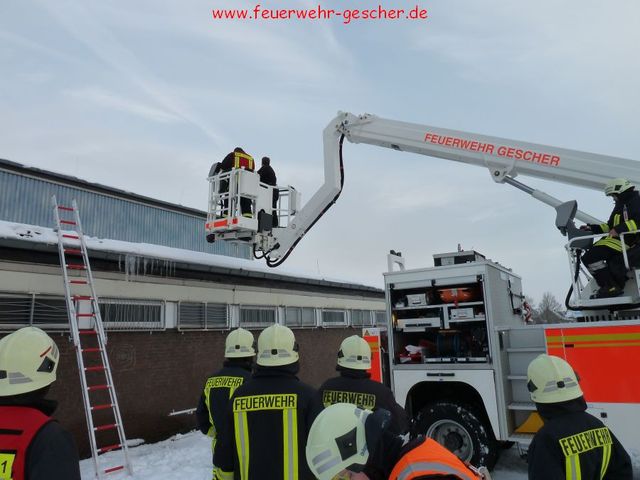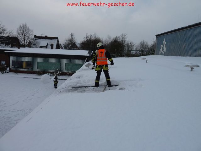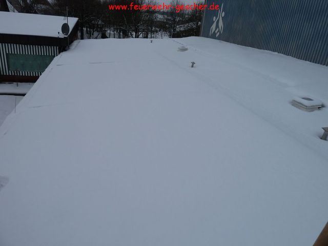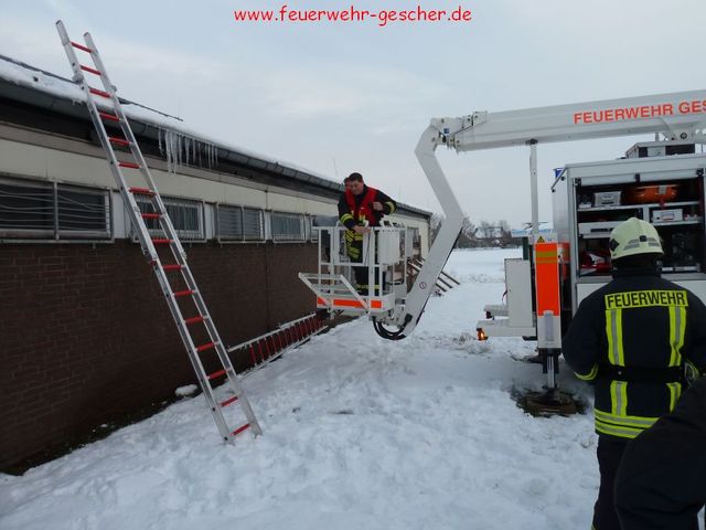 Nachdem die Stadt Gescher mit Dachdeckern und mit unserem Teleskopmast (TM22) und Stadtbrand Inspektor Christian Nolte zur Untersuchung der Dächer der öffentlichen Gebäuden ausgerückt war, wurden die Kameraden gegen 14:30 Uhr zur Wache gerufen. Mit vereinten Kräften sollte das Dach der Umkleidekabinen der Dreifachhalle am Schulzentrum von den teilweise ca. 40 cm hohen Schneemassen befreit werden. Da das gesamte Gebäude mit Photovoltaik Platten ausgelegt ist konnte das Dach nur teilweise begangen und geräumt werden. Stadtbrand Inspektor Christian Nolte ordnete darauf hin an, dass die Halle bis zur erneuten Überprüfung durch die Stadt Gescher und Statikern gesperrt wird. Gegen 17:00 Uhr war der Einsatz beendet.
