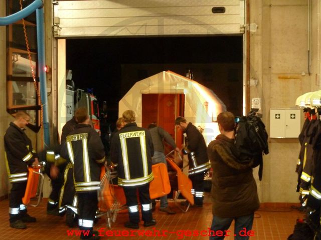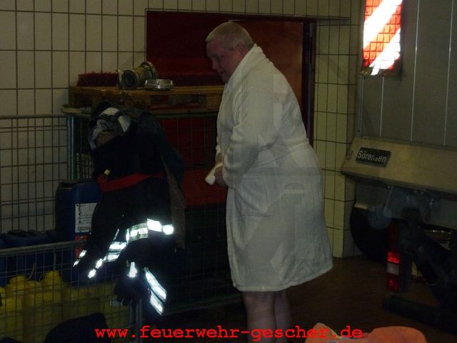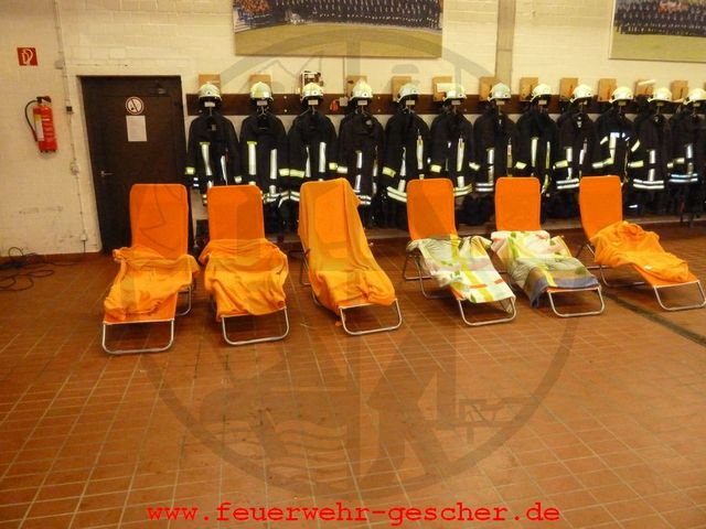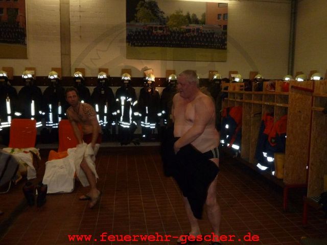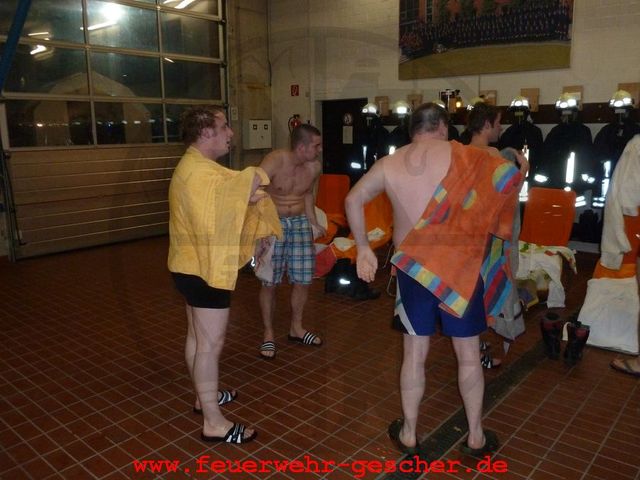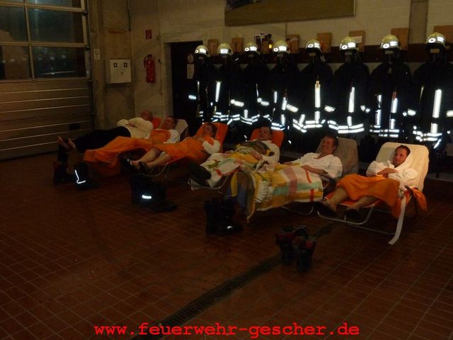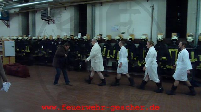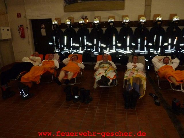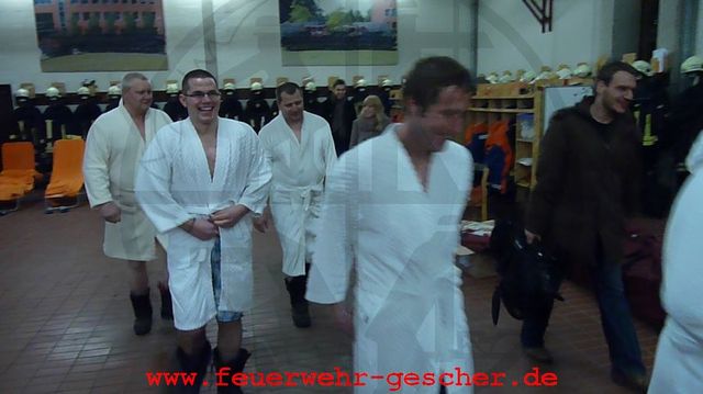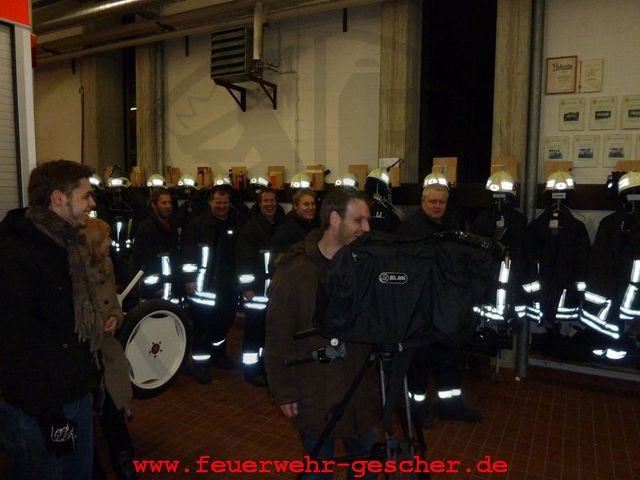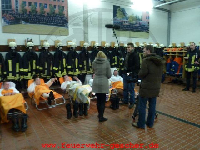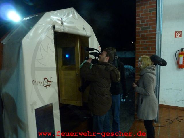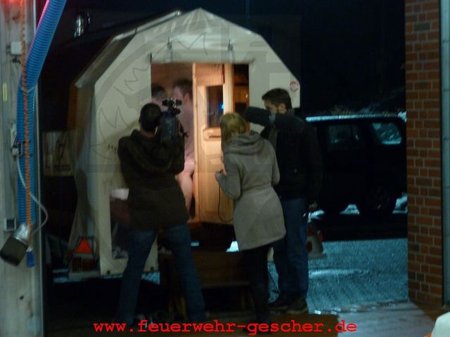Am letzten Übungsabend, 06.01.11, war es dann soweit, das Saunamobil und Filmteam trafen am Venneweg ein. Nach einer kurzen Einweisung konnte es auch schon losgehen. Am Anfang wurden die Liegestühle in der Fahrzeughalle aufgestellt. Als die Aufnahme im Kasten war tauschten Andreas Wissen, Thomas und Stefan Büter, Jan Philipp Schnieder, Uwe Luters und Michael Eskes die Einsatzkleidung gegen Bademäntel. Dann ging es auch schon in die Sauna. Jetzt noch Aufnahmen bei einem Aufguss und anschließend auf den Liegestühlen. Nach zwei Stunden war der Film gedreht.