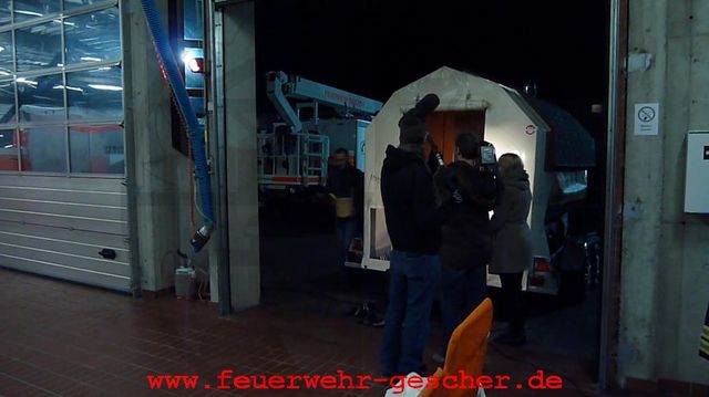 Fa. B.L.&P. GmbH aus Kassel dreht Imagefilm über Saunamobil im Gerätehaus. Kameraden des Löschzuges Gescher als Darsteller.