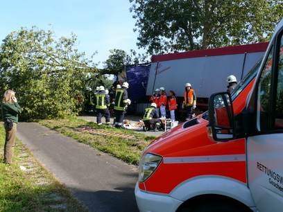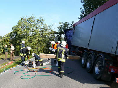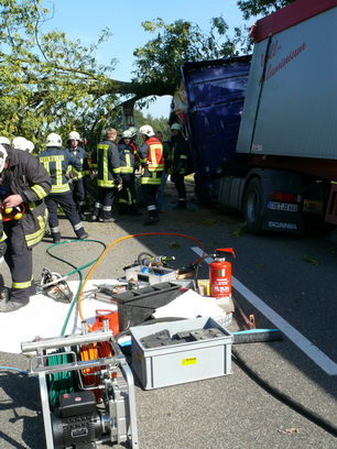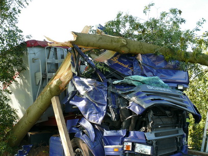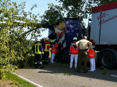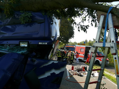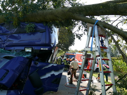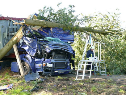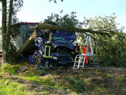 LKW fährt gegen Baum, so dass dieser auf die Fahrerkabine knickt,