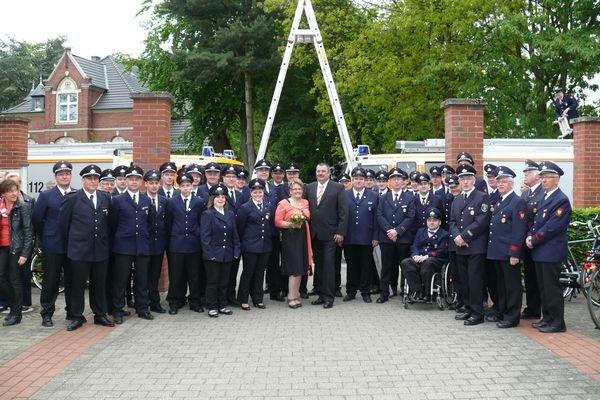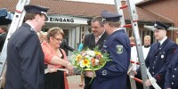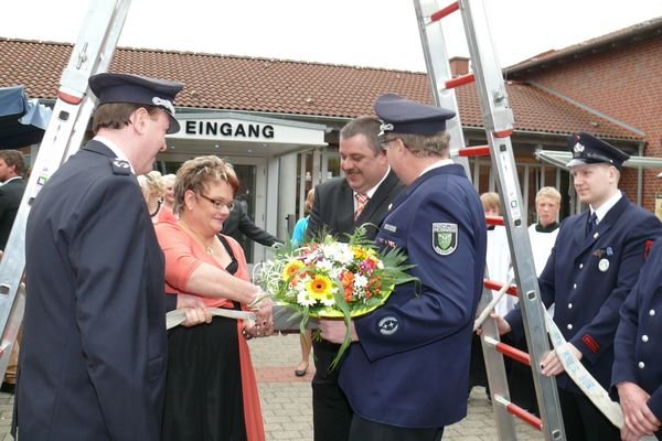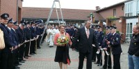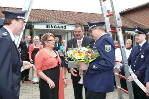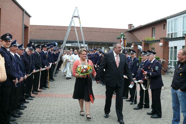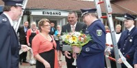 sk. Gescher. Recht groß war die Gratulantenschar anlässlich der Silberhochzeit von Martin und Mechtild Schröer. Neben den Arbeitskollegen der Firmen Eing und Huesker waren auch die Angelsportfreunde gekommen um zu gratulierten. Den Mitgliedern der Freiwilligen Feuerwehr war es Pflicht und Ehre ihrem Löschzugführer das Ehrenspalier zu bilden. Zu den ersten Gratulanten zählten Stadtbrandinspektor Christian Nolte sowie sein Stellvertreter Markus Terwey. Erst nachdem das Silberpaar Teamgeist bewiesen hatte, sie mussten gemeinsam eine Schlauchkupplung lösen, konnten sie das Spalier durchschreiten. Laut schallte dem Jubelpaar der Feuerwehrgruß der zahlreichen Kameraden entgegen.