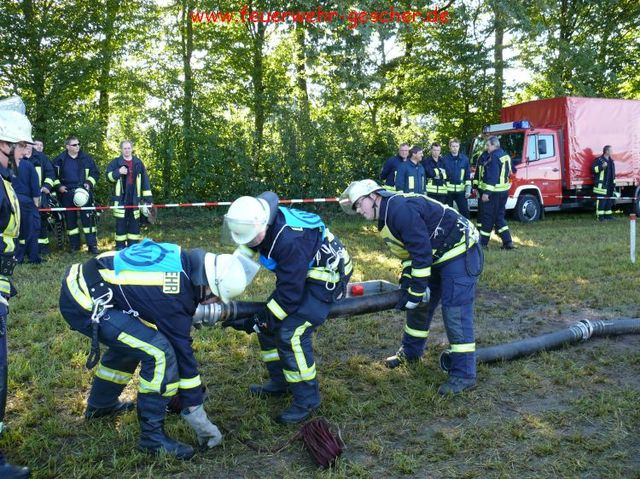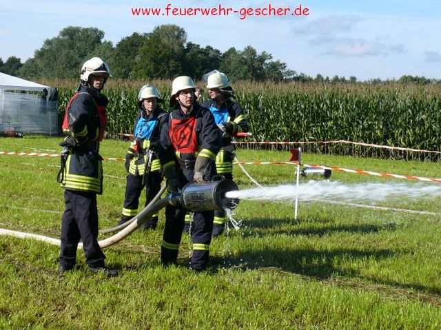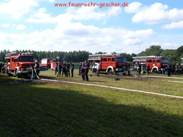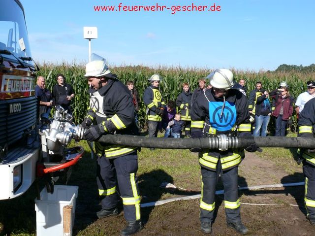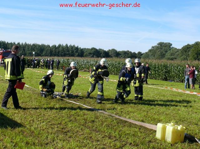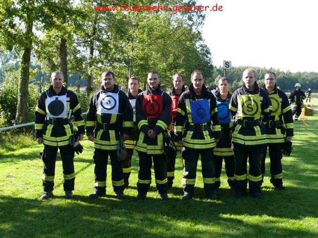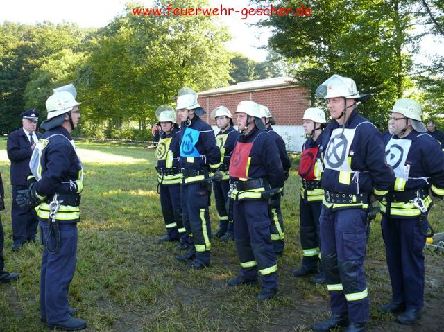 Was für Fahrzeuge der TÜV, ist für die Feuerwehren der Leistungsnachweis. Alljährlich müssen die örtlichen Löschzüge und –gruppen ihre Leistungsfähigkeit unter Beweis stellen. 85 Leistungsgruppen , aus dem Kreis traten in Legden-Asbeck an, um ihr Können zu zeigen. Es galt innerhalb von 300 Sekunden einen kompletten Löschangriff unter den Bedingungen der Feuerwehr-Dienstvorschrift (FwDV-III) zu absolvieren. „Angriffsleitung selber verlegen, zur Brandbekämpfung mit Schaum-Rohr zum Zielfeuer vor!“ Nur wenige Worte, und dennoch – die Männer der einzelnen Gruppen wussten was zu tun war. Zuvor waren die einzelnen Positionen innerhalb der Löschgruppe ausgelost worden, das heißt, das jeder Feuerwehrmann jede Position besetzen kann, sei es Angriffstrupp, Wassertrupp, Schlauchtrupp oder Melder. Kommandos wurden gerufen, Schläuche ausgerollt und gekuppelt. „Hier klappte es wie am Schnürchen“ freut sich der Kreisbrandmeister. Innerhalb von drei Minuten waren die durch drei Fallklappen gekennzeichneten Zielfeuer vom Wasserstrahl umgefallen. Doch damit nicht genug. Im theoretischen Teil mussten Fragen aus dem großen Katalog „Fahrzeug- und Gerätekunde“ richtig beantwortet werden. Feuerwehrübliche Knoten und Stiche galt es gekonnt zu zeigen. Schließlich galt es im sportlichen Teil einen Staffellauf zu absolvieren, bei dem drei Wehrmännern eine Sonderaufgabe zukam. So musste ein Rohr durchkrochen, ein Schwebebalken und eine Zwei-Meter-Bretterwand überwunden werden. „Wir können uns auf die Männer aus den Löschzügen des Kreises verlassen“,versichert der Kreisbrandmeister.