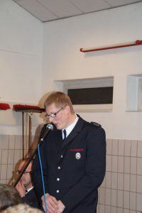 Nun war Ordnungsamtsleiter Christian Prost an der Reihe. Er betonte, dass der Löschzug Hochmoor nach wie vor einen wichtigen Bestandteil der Gesamtwehr bilde und dankte auch den Familien, die oftmals stunden- oder tagelang auf die Feuerwehrleute verzichten müssen, insbesondere an dem einsatzreichen Unwetter-Wochenende im Juni. Bei diesem Einsatz konnte er am eigenen Leib spüren wie wichtig gute Ausrüstung ist. „Ich musste einer Familie sagen, dass sie auf Grund des Hochwassers nicht mehr in ihrem Haus bleiben können. Dafür musste ich mir Gummistiefel der Feuerwehr leihen und habe schnell gemerkt das die Stiefel Löcher haben… Das war so nicht hinnehmbar.“, so Prost. Daraufhin wurden die Stiefel nach dem Wochenende überprüft und die kaputten Stiefel durch neue ersetzt. Er versprach außerdem, dass in den kommenden Jahren weiterhin die Ausrüstung und die Einsatzbekleidung aktuell gehalten werden wird. Abschließend beendete Prost seine Rede mit den besten Wünschen und das alle Kameraden immer unversehrt an Leib und Seele von ihren Einsätzen zurückkehren mögen.