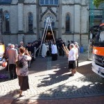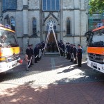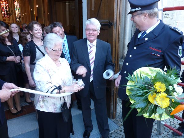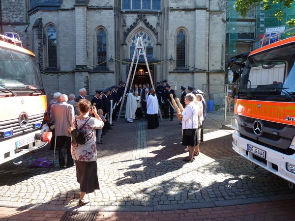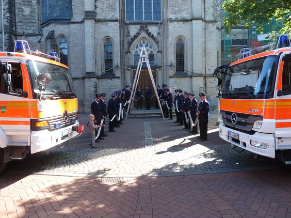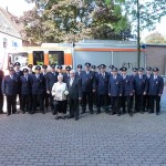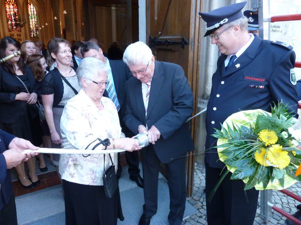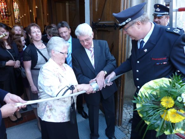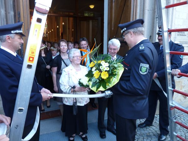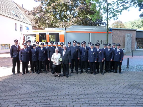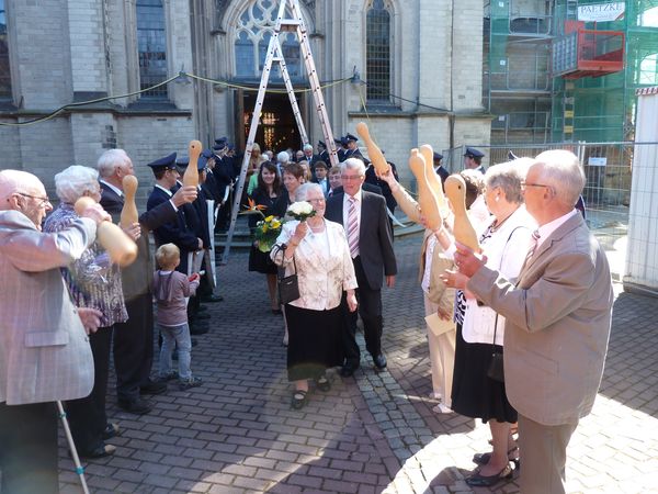 Gescher. Ein nicht alltägliches Ereignis rief die Männer der Freiw. Feuerwehr Gescher auf den Plan. Kamerad Herbert Schlüter konnte gemeinsam mit seiner Frau Mia auf fünfzig gemeinsame Ehejahre zurückblicken. Verständlich, dass die Blauröcke zu diesem Festtag das Ehrenspalier vor der St. Pankratius-Kirche bildeten. Zu den ersten Gratulanten zählte Stadtbrandinspektor Christian Nolte. Neben den Wehrmännern standen aber auch die Frauen des Kegelklub „Gut Schlauch“ dem Mia Schlüter seit der Gründung angehört, mit überdimensionierten Kegeln Spalier.