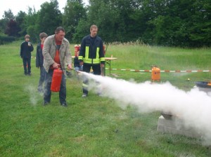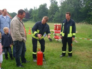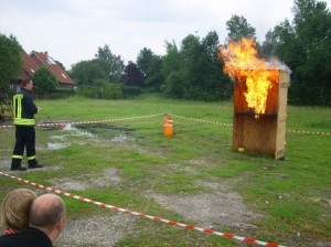 Wer wollte konnte sich im Umgang mit dem Feuerlöscher beweisen und einen kleinen Brand unter der fachkundigen Anleitung von Kai Lütkenhaus löschen: “Für zuhause empfehle ich Schaumlöscher und Löschdecke! Dann hat man eine gute Ausstattung.“, erklärte Lütkenhaus den interessierten Brandbekämpfern. Besonders die Nachstellung eines Fettbrandes und das verkehrte Löschen mit Wasser brachte viele der Anwesenden zum Nachdenken und sorgte für teils erschrockene Gesichter als die Flammen in die Höhe schossen und Angst einflößend zunächst nicht aufhörten zu lodern:“Ganz schön warm hier!“, kommentierte Egon Hüppkes als Hochmooraner Feuerwehrmann die, von ihm inszenierte, Explosion des Fettes.