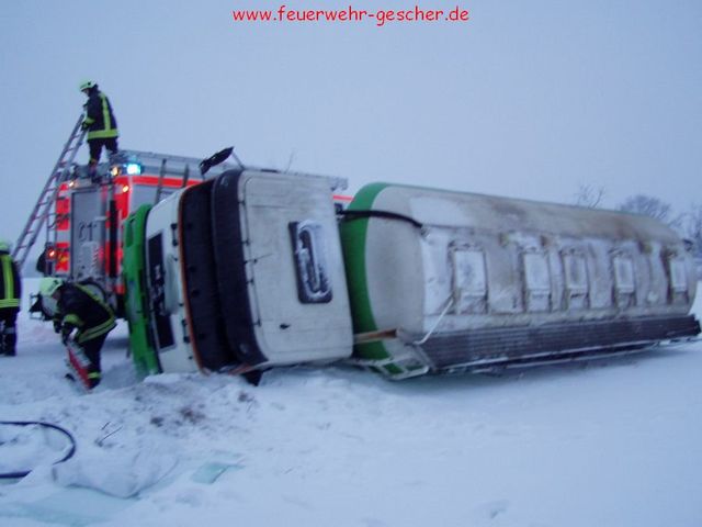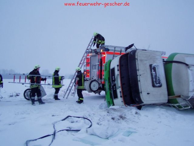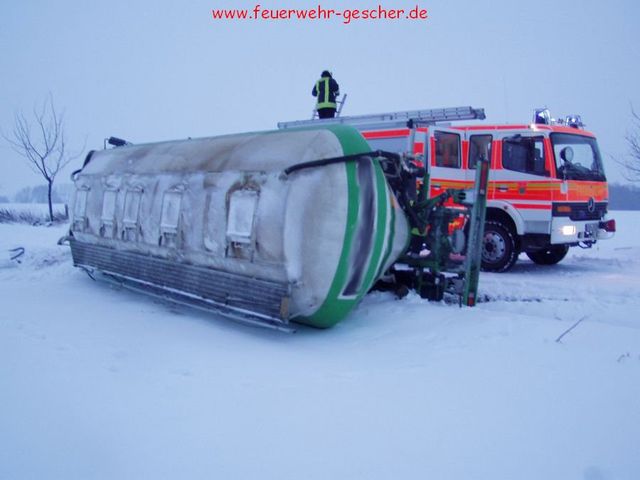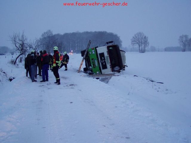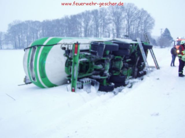 Zu einem Verkehrsunfall sind die Kameraden vom Löschzug (LZ) Gescher Stadt am 23.12.2010 um 15:40 Uhr zu einem Wirtschaftsweg in die Bauerernschaft Tgl Capellen gerufen worden. Aus bislang ungeklärter Ursache ist ein Silozug von der Fahrbahn abgekommen und auf die Fahrerseite gestürzt Die Kameraden des LZ mussten die Windschutzscheibe des LKW aufschneiden und konnten den eingeklemmten Fahrer befreien und an den Rettungsdienst und Notarzt übergeben.